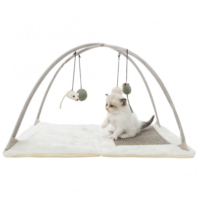 Die Trixie Kratzmatte kombiniert Sisal zum Krallenwetzen mit weichem Plüsch und spannenden Spielzeugen. Ideal für neugierige Kitten und aktive Stubentiger.