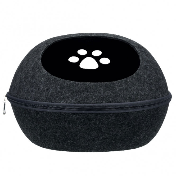 Liva besteht aus robustem, isolierendem Filz und lässt sich durch den Reißverschluss entweder als komplette Höhle nutzen oder offen als Bett. Ein weiches Kissen macht beide Varianten bequem.